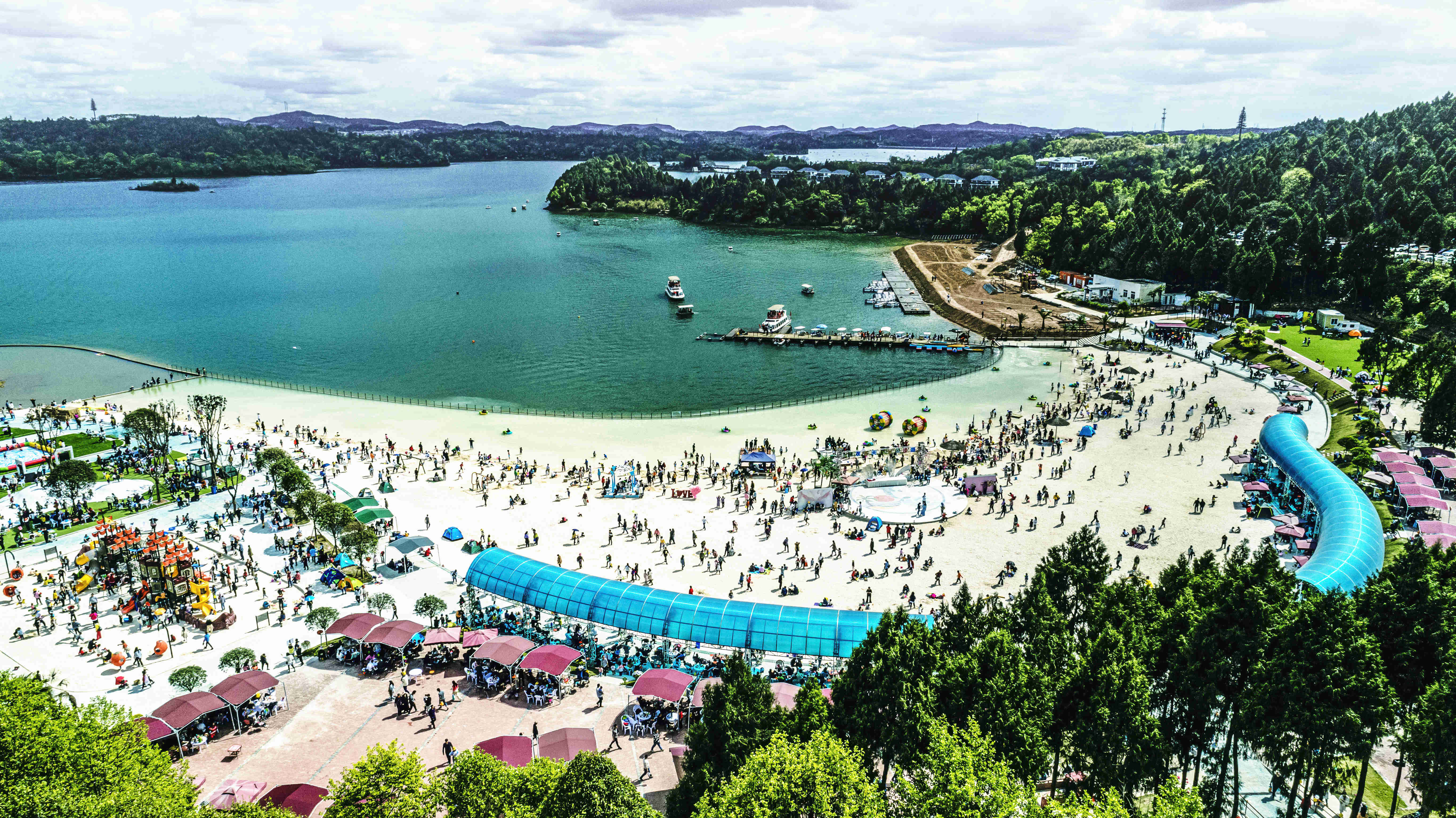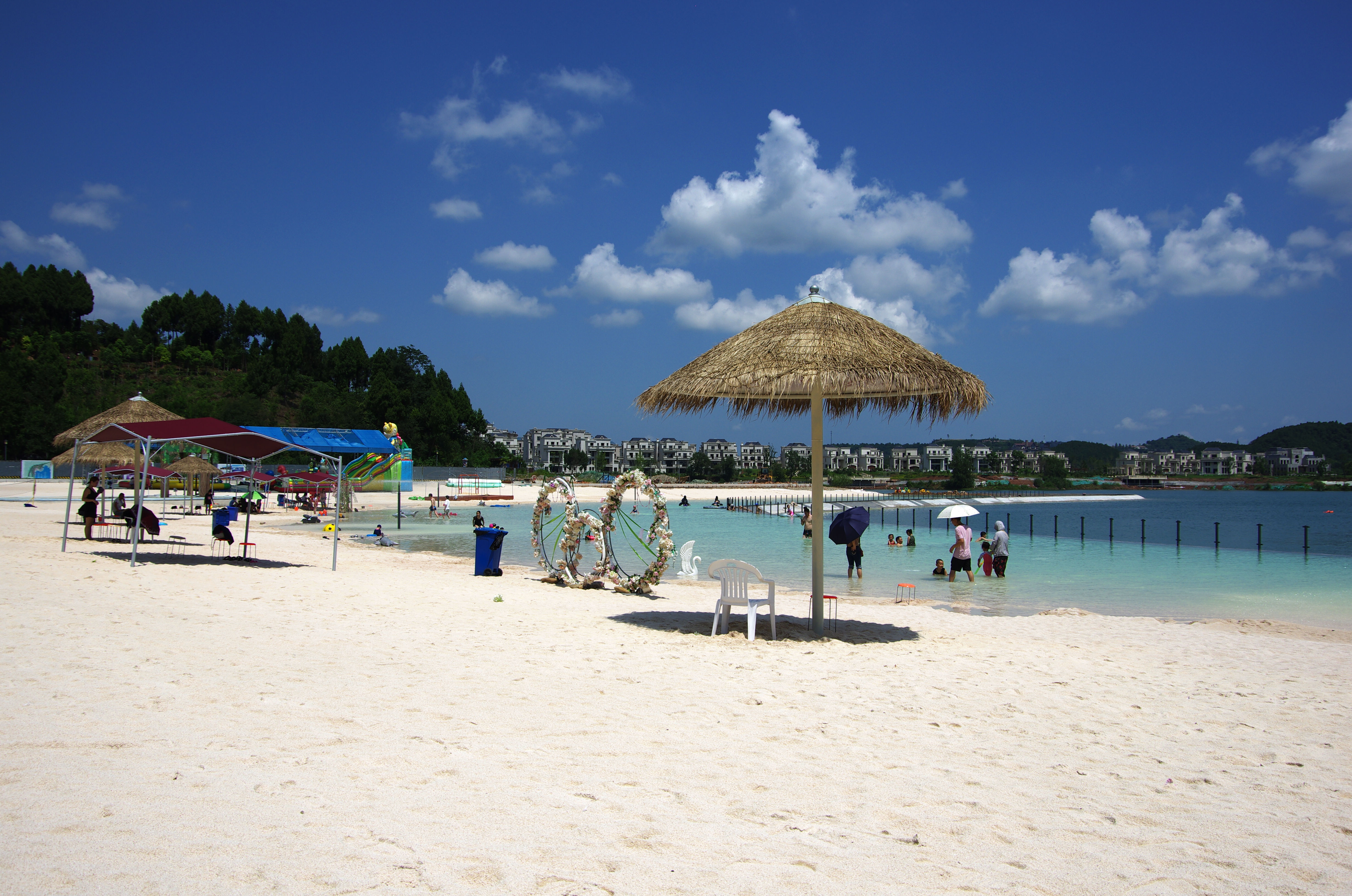綿陽(yáng)嘉成文化旅游有限公司是一家旅游開發(fā)公司,成立于2019年。 親水灣沙灘樂(lè)園項(xiàng)目由綿陽(yáng)嘉成文化旅游有限公司開發(fā)運(yùn)營(yíng),位于國(guó)家級(jí)水利風(fēng)景區(qū)——綿陽(yáng)市仙海水利風(fēng)景區(qū),距綿陽(yáng)市區(qū)15公里,車程約半個(gè)小時(shí),是依托沉抗水庫(kù)建設(shè)的仙海風(fēng)景區(qū)重點(diǎn)旅游項(xiàng)目。進(jìn)入仙海風(fēng)景區(qū)上坡向左進(jìn)入環(huán)湖路前行1000米。項(xiàng)目總占地220畝,其中核心沙灘樂(lè)園占地100畝,現(xiàn)建成沙灘休閑、淺灘嬉水、水上運(yùn)動(dòng),親子蹦蹦云、網(wǎng)紅多人秋千、人力過(guò)山車、水幕秋千、團(tuán)隊(duì)拓展等項(xiàng)目十余個(gè),還開設(shè)有特色中餐、仙海火鍋魚,自助燒烤等飲食項(xiàng)目。 近觀青山綠水,遠(yuǎn)眺碧波蕩漾,清晨朝霞映翠、傍晚水天一色。親水灣沙灘主題樂(lè)園有可容納200人的沙灘會(huì)議室和30人的小型會(huì)議室;棋牌室16間; 商務(wù)KTV;餐飲中心可同時(shí)容納300人用餐;篝火晚會(huì)場(chǎng)地等,是婚禮壽宴、同學(xué)聚會(huì)、餐飲娛樂(lè)、商務(wù)會(huì)議、拓展培訓(xùn)、家庭親子活動(dòng)的首選之地。